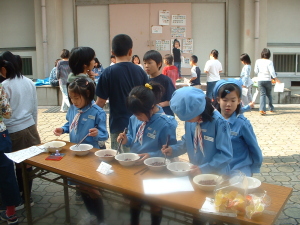 炊き込みご飯とスープ、国旗あてクイズ、一円玉浮かし、豆はこび、こままわし、ロープワークのスタンプラリー。