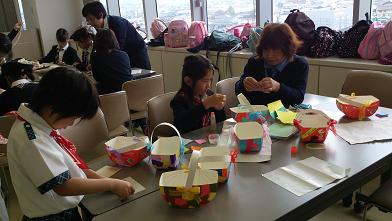 牛乳パックの小物入れに紙を貼ったり、折り紙を折ったりしました。