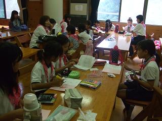 活動着に着替えてパトロール旗に絵を描きました。