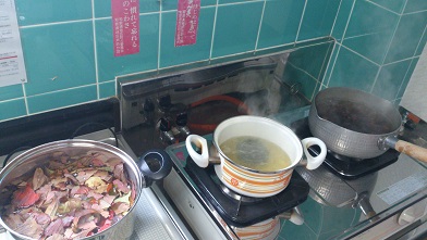 ジュニアは、イチゴの葉っぱ・カモミール・どんぐりを、お鍋で煮だして、