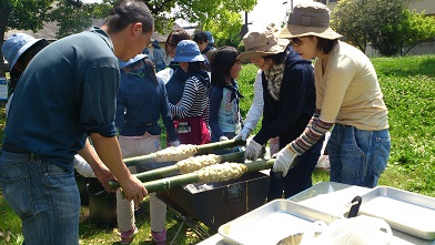 お母さんやスカウトの兄弟で、竹を利用してバームクーヘンを作りました。