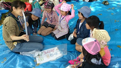 キャンプの紙芝居を見ました。シュロの葉でバッタを作りました。