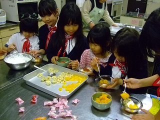 出来上がったプリンに、果物と生クリームで飾り付け。
