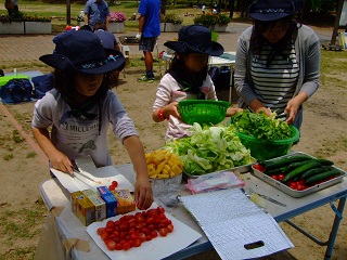 保護者の方にも手伝ってもらって、野菜や果物をいっぱい切りました。