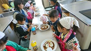 3組の体験のお友だち親子と一緒に、雪だるまカレーを作りました。