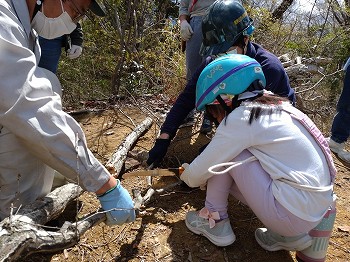 各部門、エリアに別れて、木挽や剪定バサミを使って作業を行いました。生木を切るのは、コツと力がいります。皆、森をきれいにするためにがんばって取り組んでくれました。