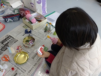 その後は、先ほどのゲームでシニアさんにもらったお菓子を入れるための入れ物をクラフトしました。