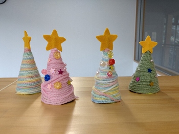 テンダーは、クリスマスのクラフトをしました。きれいな色の毛糸を丁寧に巻いて、キラキラ飾りをつけて。とっても素敵なツリーができました!