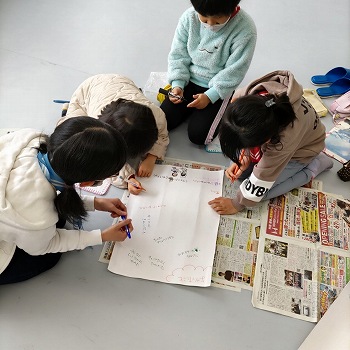 キャンプの振り返り、大きな紙に、良かったこと、困ったことを書いていきました。どちらも食べ物に関することが多いような。。。