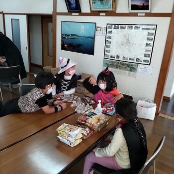 まずは、お菓子を入れるかぼちゃバッグ作り。ちょっと難しいけど、リーダーの説明を聞きながら丁寧に作りました。顔のところは、それぞれがこだわって、個性的なバッグができました