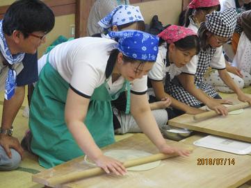 4人1組になり、そば打ち名人の方の話をよく聞き、