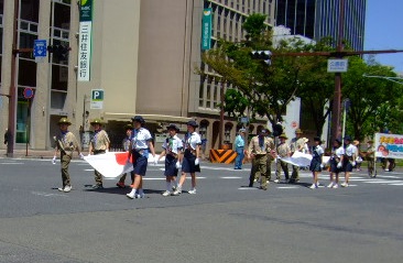 シニアは、国旗と団旗を持ちました。