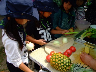 保護者の方にも手伝ってもらって、野菜や果物をいっぱい切りました。