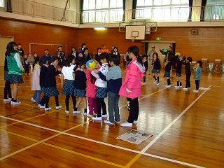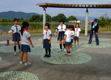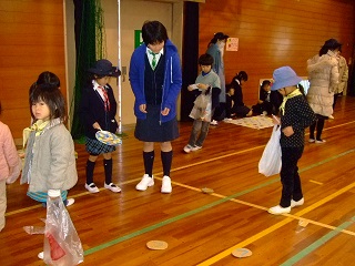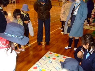 ◎ゲーム ロープの輪の中にお手玉を投げ入れます。うまく入るかな?