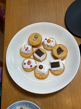 電子レンジを使ってマシュマロを柔らかくして、自分なりのアレンジ、デコレーションしました。チョコペンをつかったり、上に好きなトッピングをのせたり、いつもの野外でのサモアと違うものができあがり、ぽぽちゃんのお家を歌って、お待ちかねの試食タイム。