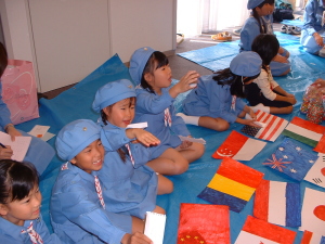 スカウトたちが作った国旗をならべ、知っている国旗を五つ言えたら飴をあげるというもの。