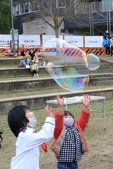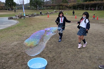 次は、大きなシャボン玉作り。棒に毛糸とオモリをつけるのは保護者の方に作ってもらって、子どもたちは、ペットボトルに水と洗濯のりと台所用洗剤を入れて、混ぜるためにみんなでペットボトルを振りました。あわあわになっちゃった。